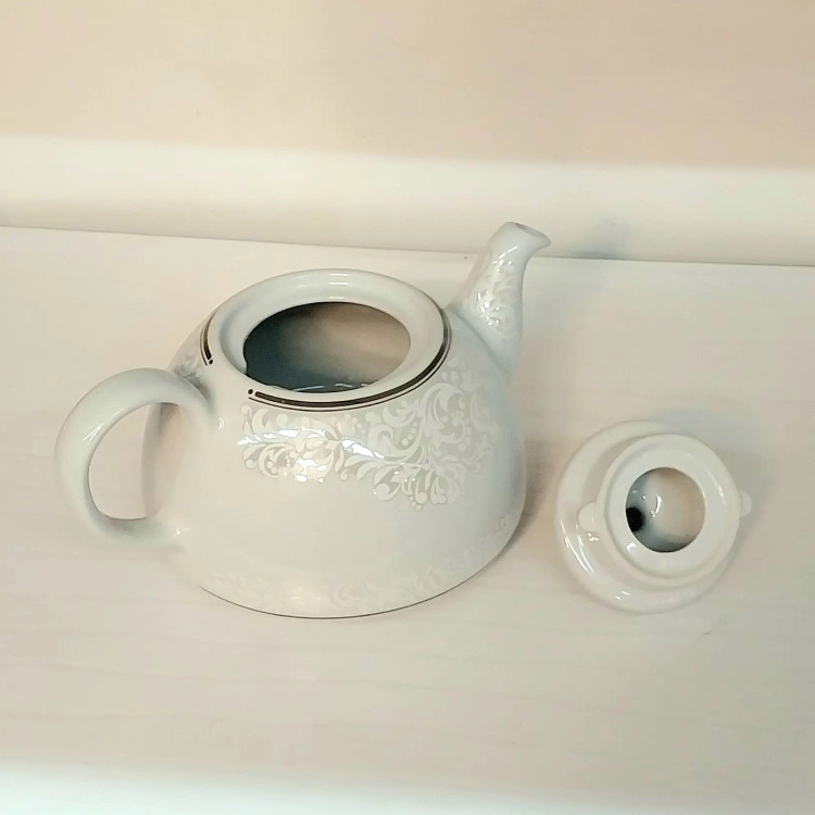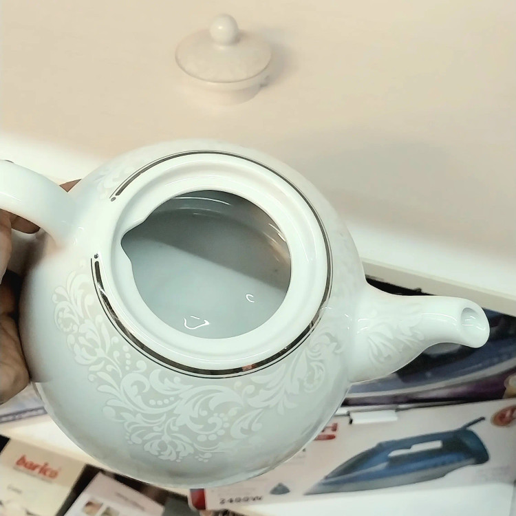 قوری چینی برند معتبر شکس دارای کف پهن جهت دم آوری بهتر چای طراحی زیبا و ارگونومیک درب دو قفل رنگ سفید و نقره ای