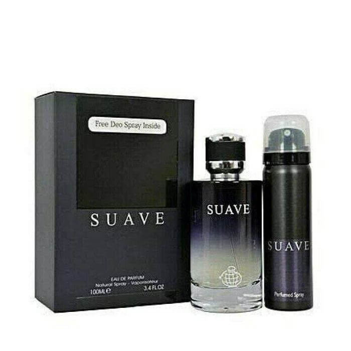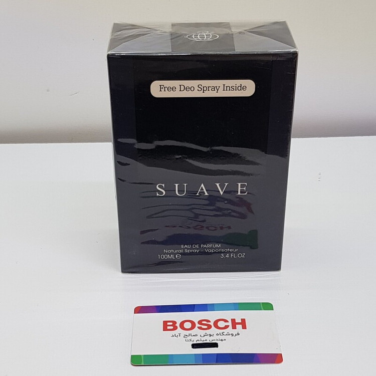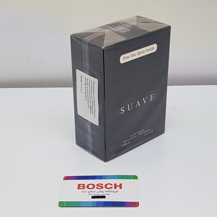 شیشهی مشکی این عطر با نام Suave و نشان تجاری Fragrance World تزئین شده است. درب سیاه رنگ با سه خط موازی، به این عطر ظاهری منحصربهفرد و شیک بخشیده است که به راحتی از سایر عطرها قابل تشخیص است.